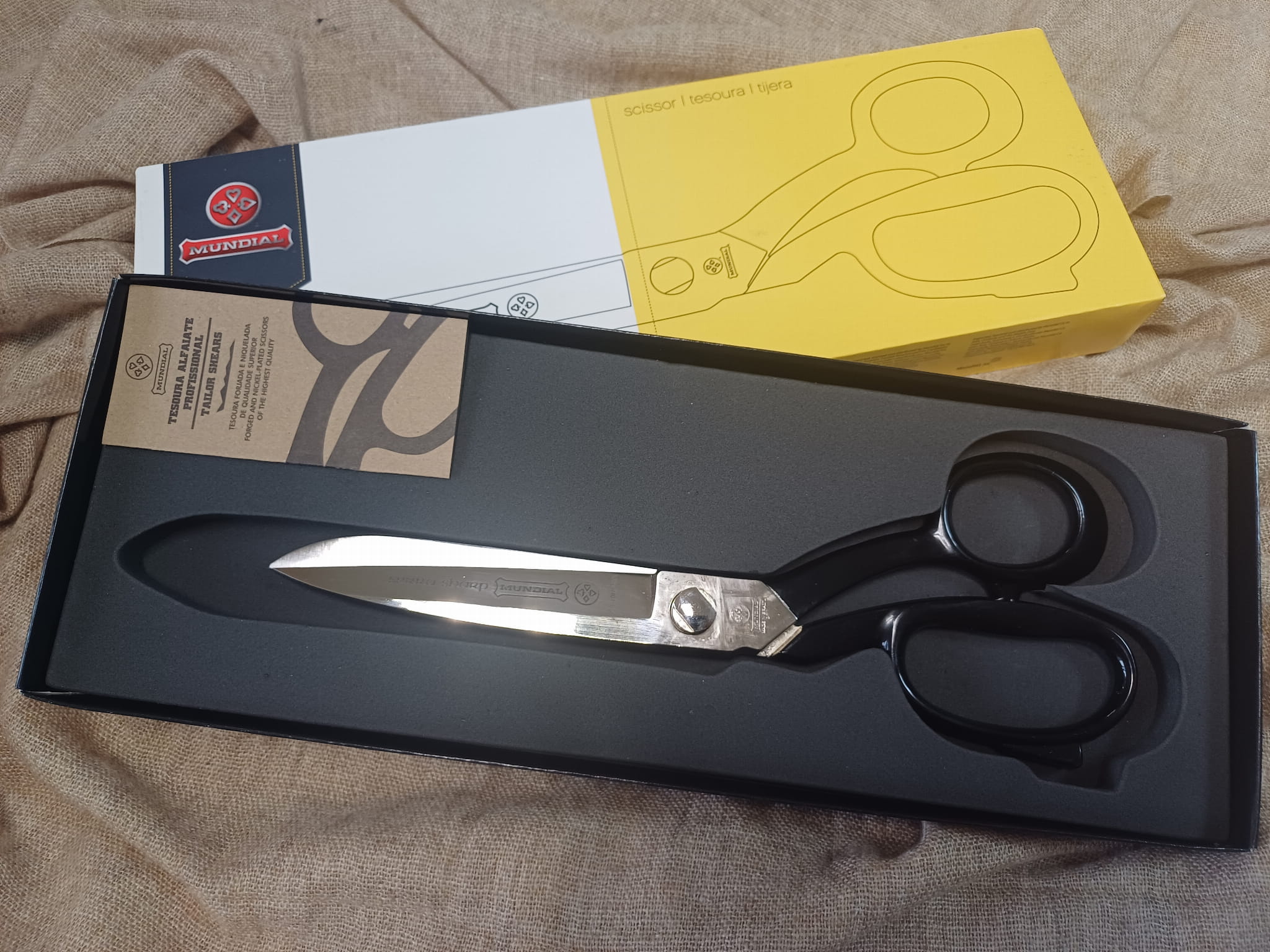 Mocne i precyzyjne nożyczki krawieckie marki MUNDIAL o długości całkowitej 10 cali (25,4 cm) i długości ostrza 9,5 cm. Wykonane w całości z kutej, niklowanej stali wysokowęglowej – zapewniają trwałość, ostrość i odporność na intensywną eksploatację.
