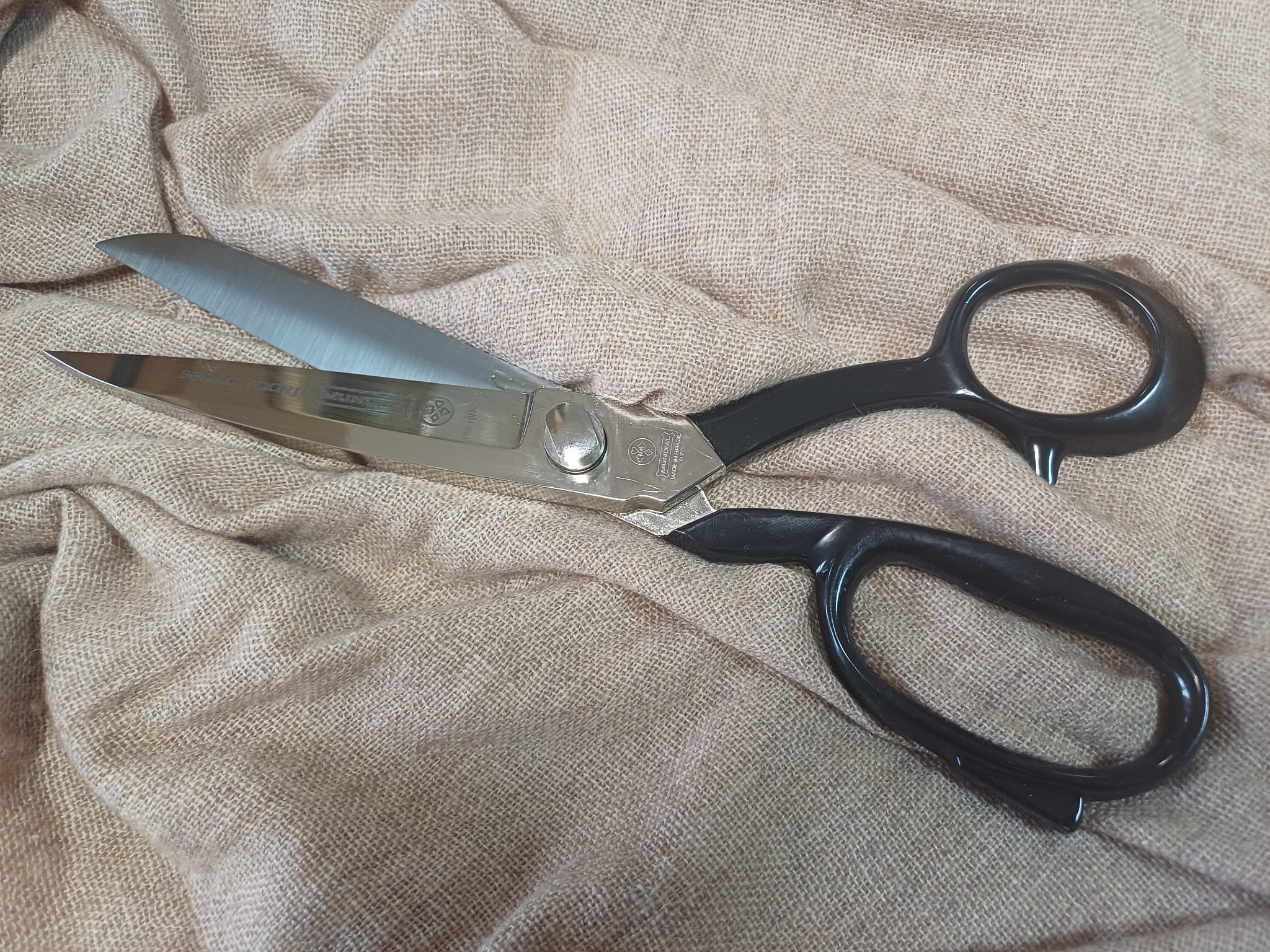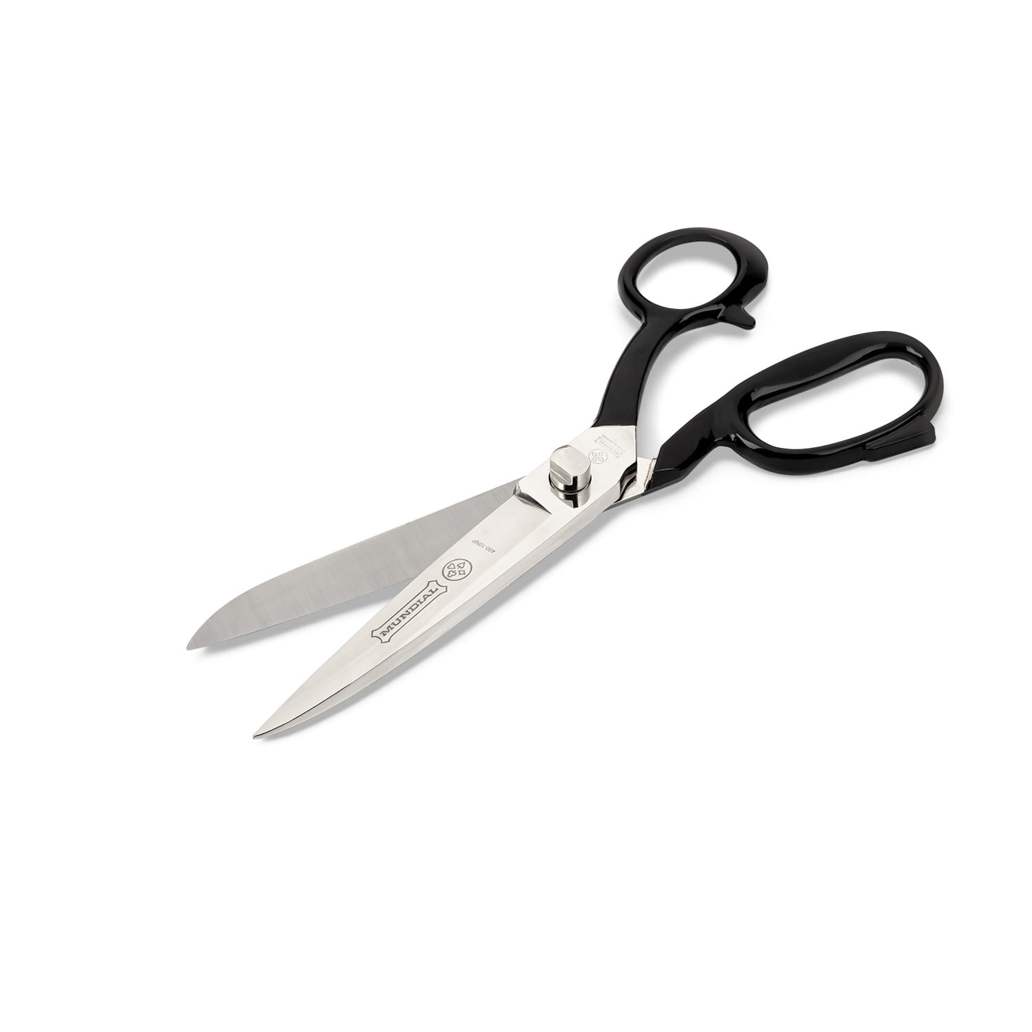 Profesjonalne nożyczki krawieckie i szwalnicze marki MUNDIAL o długości całkowitej 10 cali (25,4 cm) i długości ostrza 9,5 cm. Wykonane z kutej, niklowanej stali wysokowęglowej, z dodatkową krawędzią ostrza z mikroząbkami.