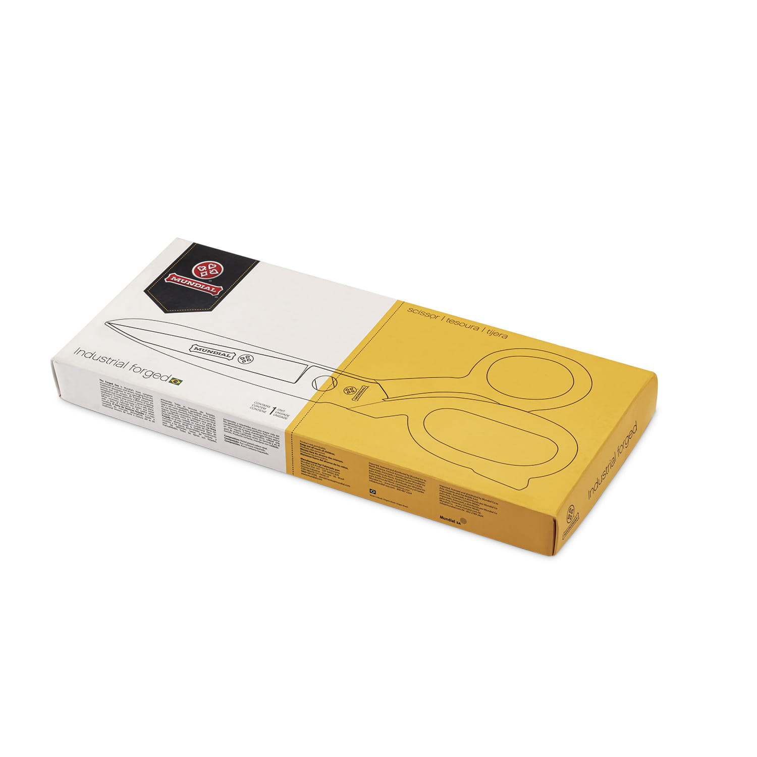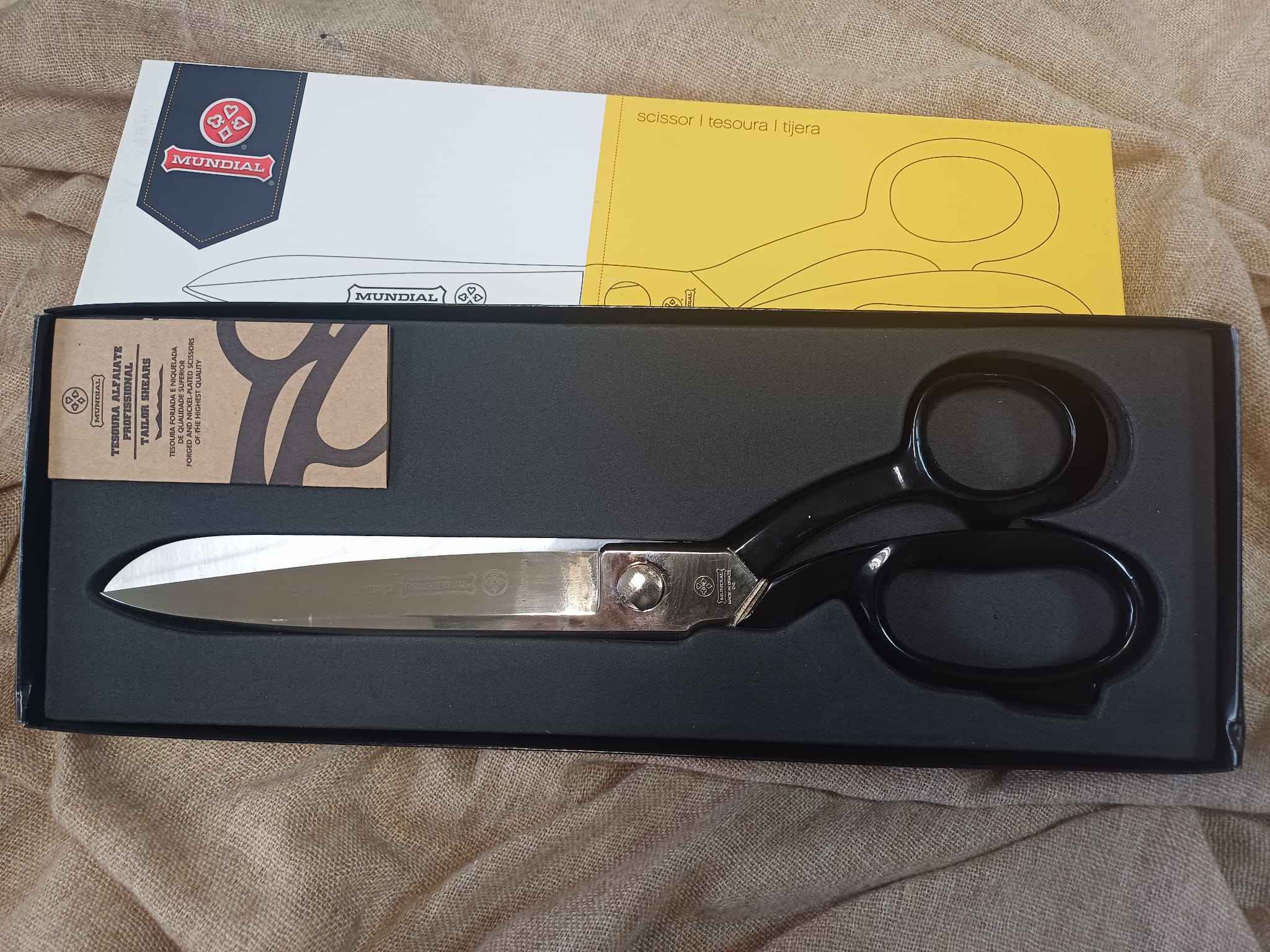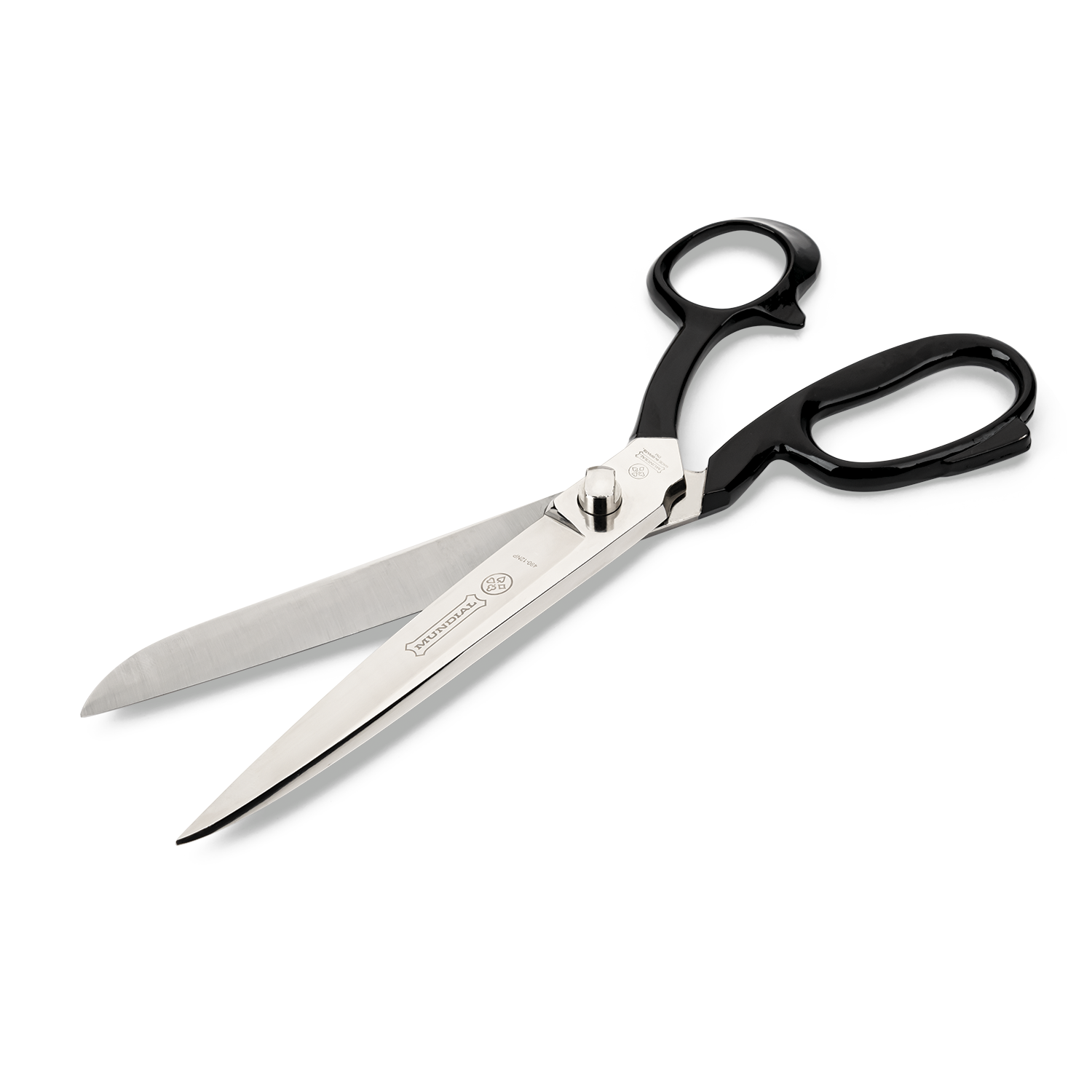 Największe i wyjątkowo mocne nożyczki krawieckie marki MUNDIAL o długości całkowitej 12 cali (30,5 cm) i długości ostrza 10,2 cm. Wykonane w całości z kutej, niklowanej stali wysokowęglowej z gładkimi krawędziami ostrzy.