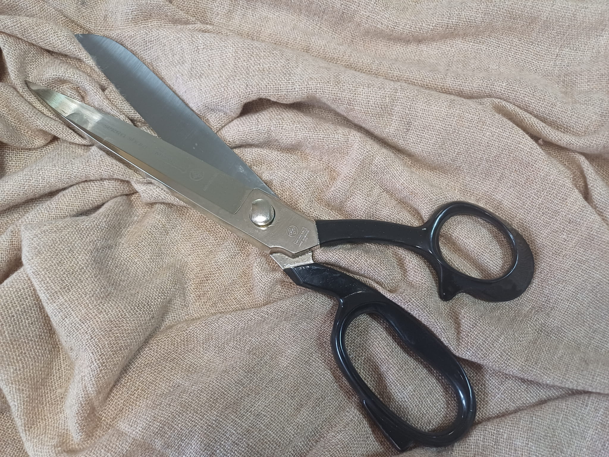 Największe nożyczki krawieckie marki MUNDIAL o długości całkowitej 12 cali (30,5 cm) i długości ostrza 10,2 cm. Wykonane z kutej, niklowanej stali wysokowęglowej, wyposażone w ostrza z mikroząbkami, które ułatwiają cięcie śliskich materiałów.