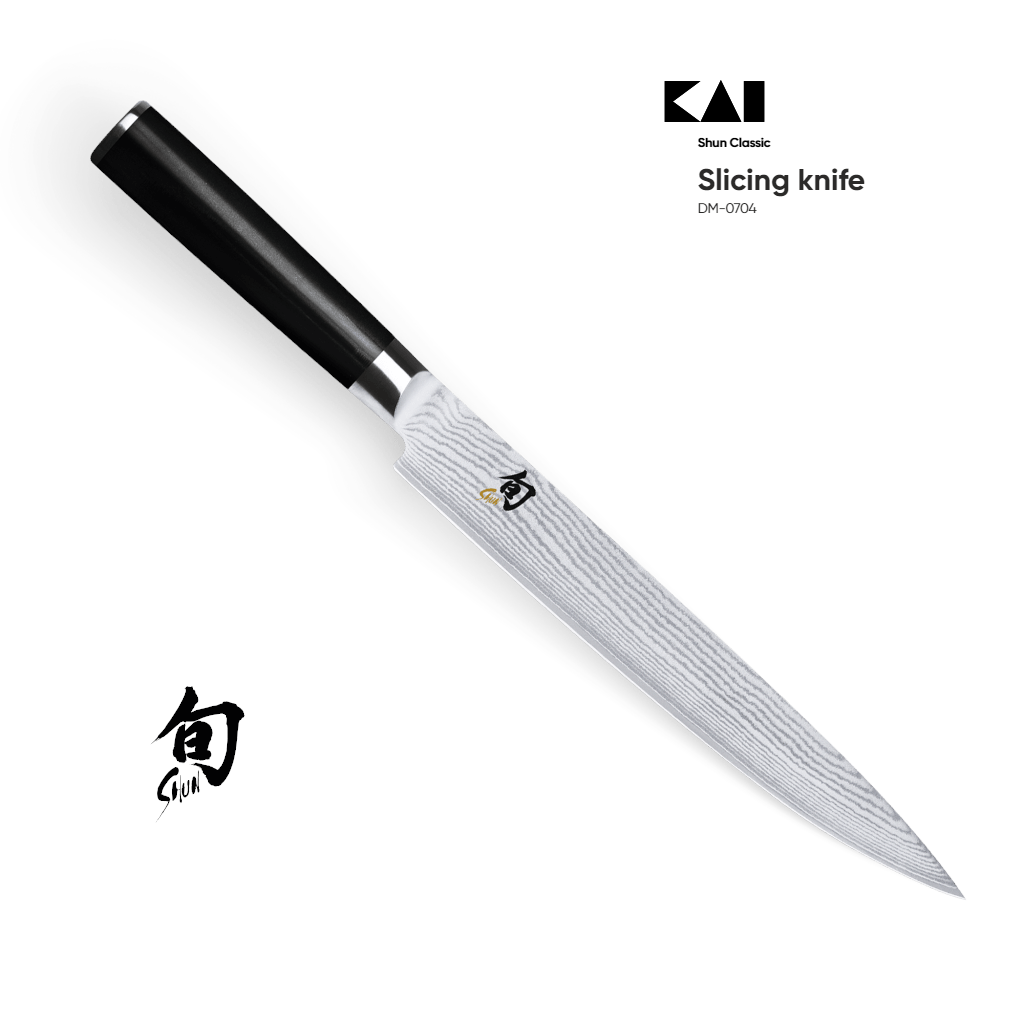 Charakterystyczną cechą noży Shun są widoczne na nich warstwy przypominające linie papilarne i podobnie jak one są tak samo niepowtarzalne. Noże firmy KAI są niezwykle ostre i znakomicie wyważone, tworzone w oparciu o tradycję produkcji mieczy samurajskich. Są idealne do precyzyjnego cięcia nawet najcieńszych plastrów i tworzenia fantazyjnych dekoracji.